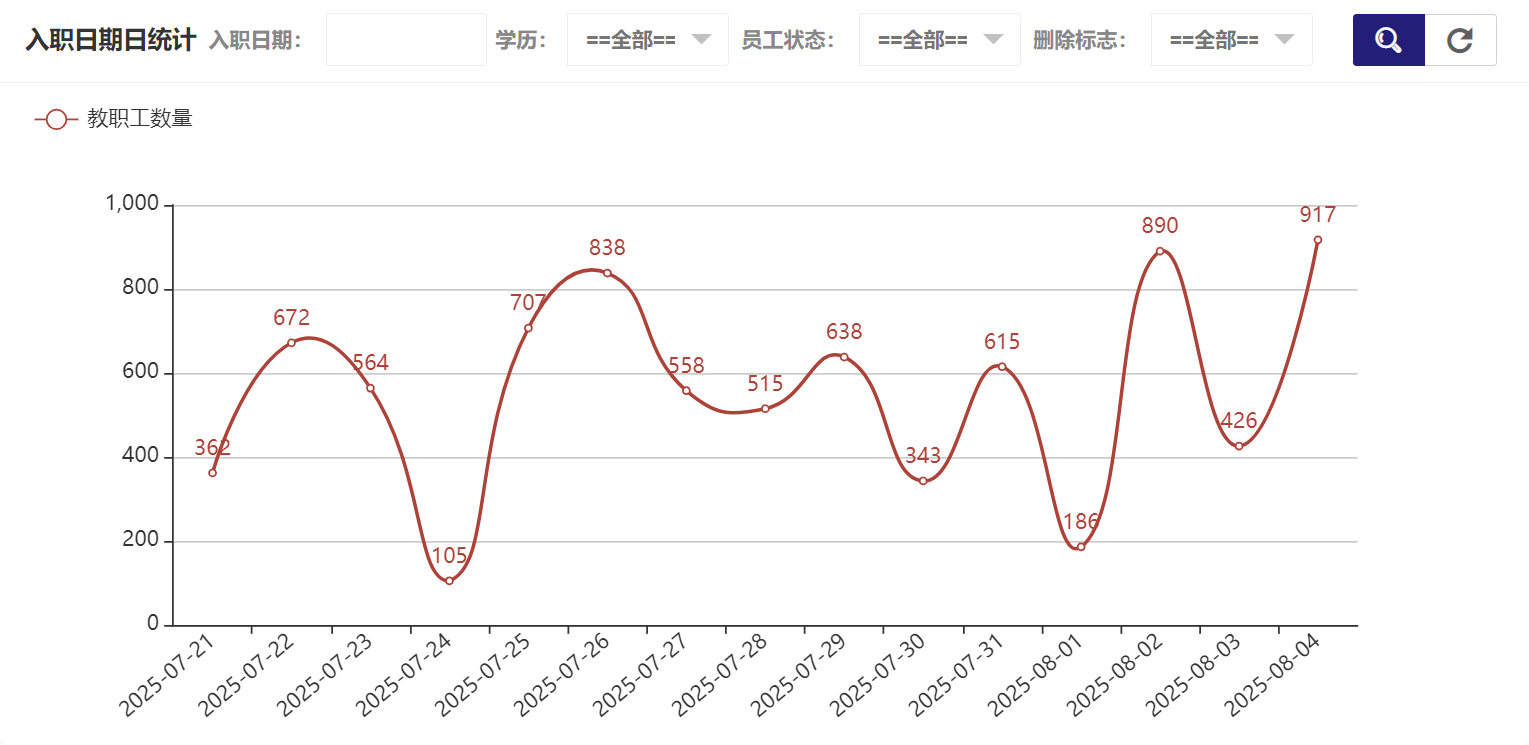 在教职工统计中可以看到入职日期年统计、入职日期月统计、入职日期日统计、离职日期年统计、离职日期月统计、离职日期日统计、学历统计、员工状态统计、删除标志统计,入职日期日统计如图所示: