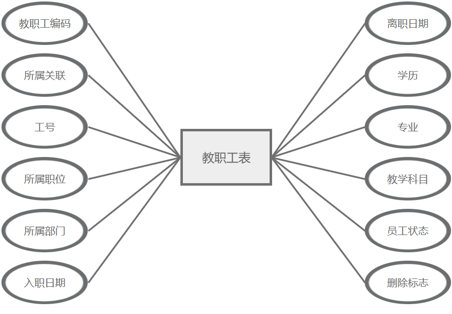 教职工管理主要属性包括:教职工编码、所属关联system_user、工号、所属职位、所属部门、入职日期、离职日期、学历、专业、教学科目、员工状态、删除标志。
