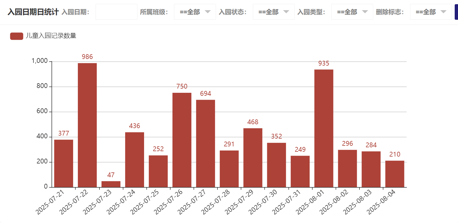 在儿童入园记录统计中可以看到入园日期年统计、入园日期月统计、入园日期日统计、离园日期年统计、离园日期月统计、离园日期日统计、所属班级统计、入园状态统计、入园类型统计、删除标志统计,入园日期日统计如图所示: