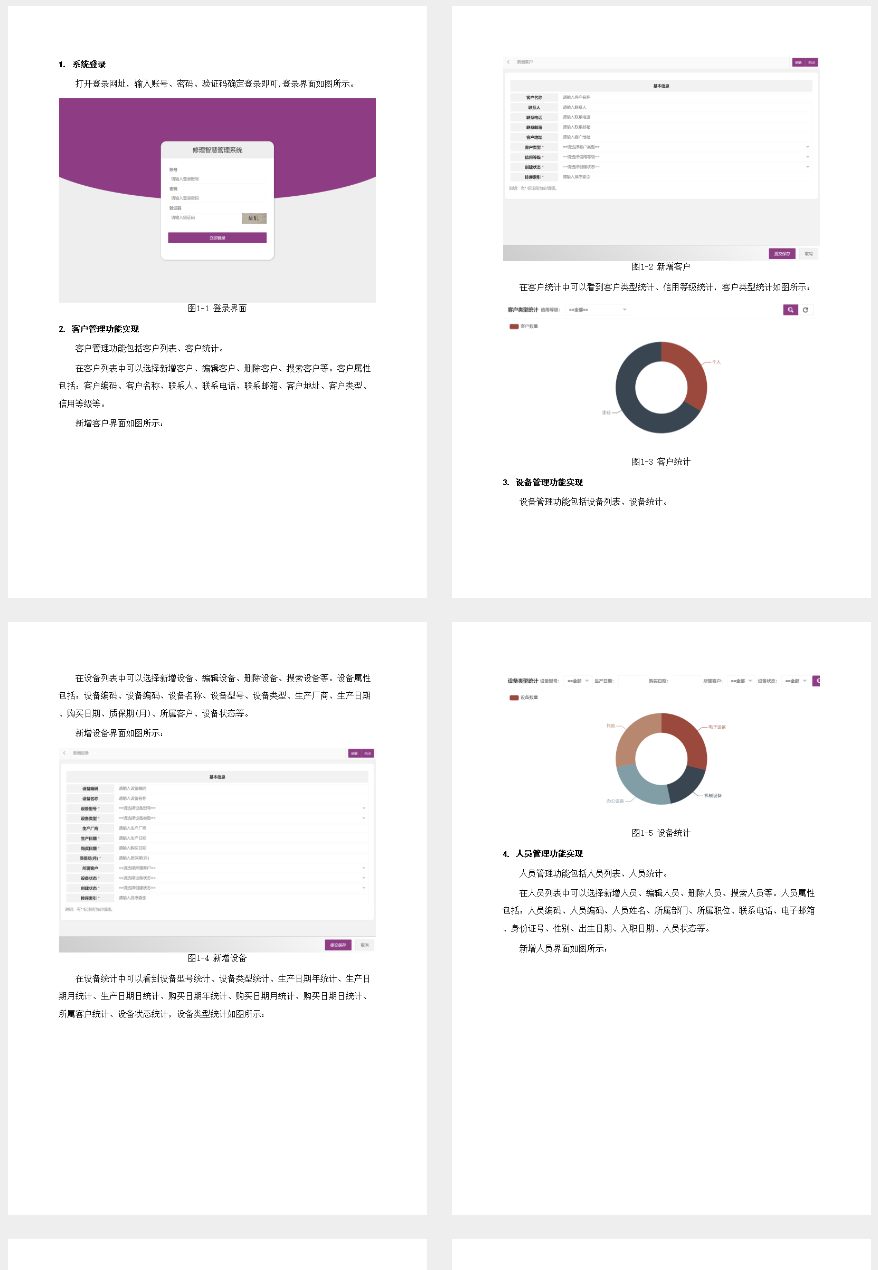为什么选择这个题目:本系统旨在解决修理企业信息化管理难题,提升工作效率与管理水平。通过引入先进的信息技术手段,实现数据自动化处理、决策支持及业务流程优化,满足现代企业管理需求。 开发背景分析:当前市场上缺少针对中小型修理企业的全面管理系统解决方案,普遍存在信息孤岛现象,无法有效整合资源。同时,随着行业竞争加剧和技术进步,企业迫切需要提升信息化水平以应对市场变化和客户需求。本系统旨在填补这一空白,并为同类企业提供参考案例与实施路径。 需求分析:系统需支持客户、设备、人员等基础数据管理;实现修理订单、维修任务及配件采购全流程跟踪;提供库存、仓库、合同等相关信息查询功能,确保企业运营透明度。此外还需具备高效的通知机制和问题反馈处理能力,以增强用户体验并促进持续改进。 系统设计:采用SpringMVC框架开发后端逻辑与接口,使用MySQL作为数据库存储数据,并通过前后分离架构实现模块化管理。利用ECharts.js等工具进行图表展示及数据分析可视化,提高决策支持效率。 系统实现:具体实施步骤包括需求调研、概要设计、详细设计、编码实现以及测试上线四个阶段;重点关注领域包括权限控制机制建立、事务处理优化与数据安全保障措施确立。