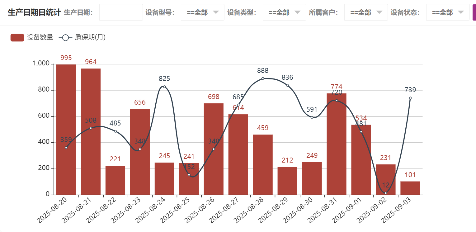 在设备统计中可以看到设备型号统计、设备类型统计、生产日期年统计、生产日期月统计、生产日期日统计、购买日期年统计、购买日期月统计、购买日期日统计、所属客户统计、设备状态统计,生产日期日统计如图所示:
