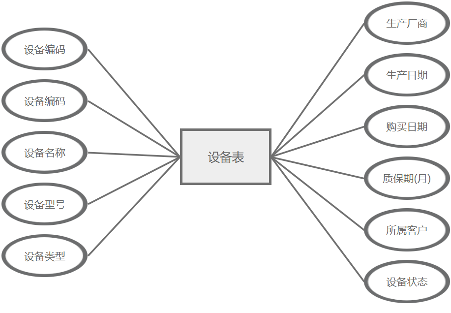 设备管理主要属性包括:设备编码、设备编码、设备名称、设备型号、设备类型、生产厂商、生产日期、购买日期、质保期(月)、所属客户、设备状态。