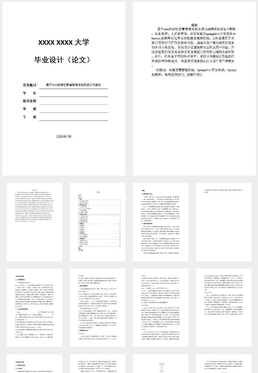 毕设从0到1!基于Java的修理智慧管理系统的设计与实现全方位解析旨在解决传统修理管理方式中信息孤岛、数据分散及效率低下等问题。该系统涵盖了客户管理、设备管理、人员管理等24个主要功能模块,为普通员工和部门领导提供高效的数据录入、查阅执行、审核分析等功能。此选题不仅创新性地整合了多项管理系统的核心需求,并且实用性极高,在实际应用中能显著提高修理行业的管理水平。 该系统采用SpringMVC开发框架构建前端与后端交互界面及业务逻辑,使用MySQL作为数据库存储各类信息数据。通过模块化设计,使得各个功能组件独立又相互关联,便于零基础开发者上手学习和深入理解。同时,结合多级权限控制、数据可视化报表生成等特性,大大提升了系统的易用性和功能性。 系统不仅能够帮助修理企业更好地管理客户资源与设备资产,还能提升员工工作效率,并通过数据分析为企业决策提供支持。此外,该管理系统还具备较高的扩展性及灵活性,可根据具体需求进行调整优化。在实现过程中,项目涉及数据库设计、前后端交互逻辑编写等多个环节,均经过详细分析和精心规划以确保最终效果满足用户预期。 此毕设选题旨在填补传统修理管理软件功能单一的空白,并通过详实的技术文档和完善的功能模块为使用者提供全面的学习资源支持。