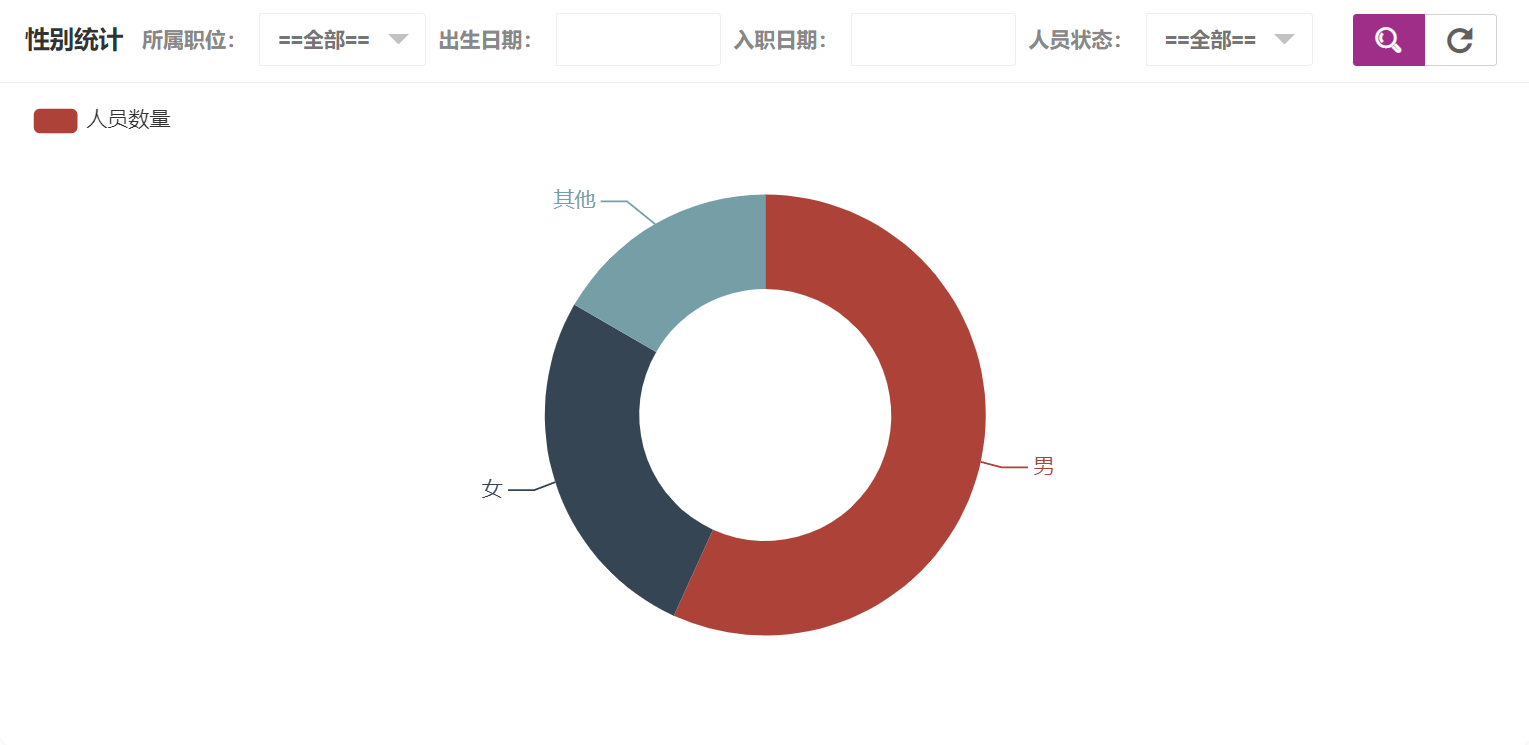 在人员统计中可以看到所属职位统计、性别统计、出生日期年统计、出生日期月统计、出生日期日统计、入职日期年统计、入职日期月统计、入职日期日统计、人员状态统计,性别统计如图所示: