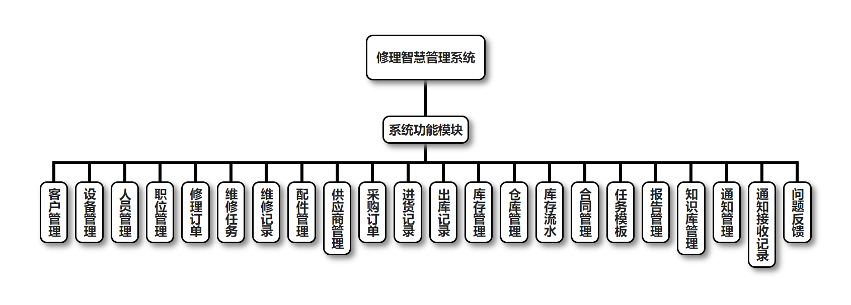 修理智慧管理系统的主要功能包括:客户管理、设备管理、人员管理、职位管理、修理订单管理、维修任务管理、维修记录管理、配件管理、供应商管理、采购订单管理、进货记录管理、出库记录管理、库存管理、仓库管理、库存流水管理、合同管理、任务模板管理、报告管理、知识库管理、通知管理、通知接收记录管理、问题反馈管理。