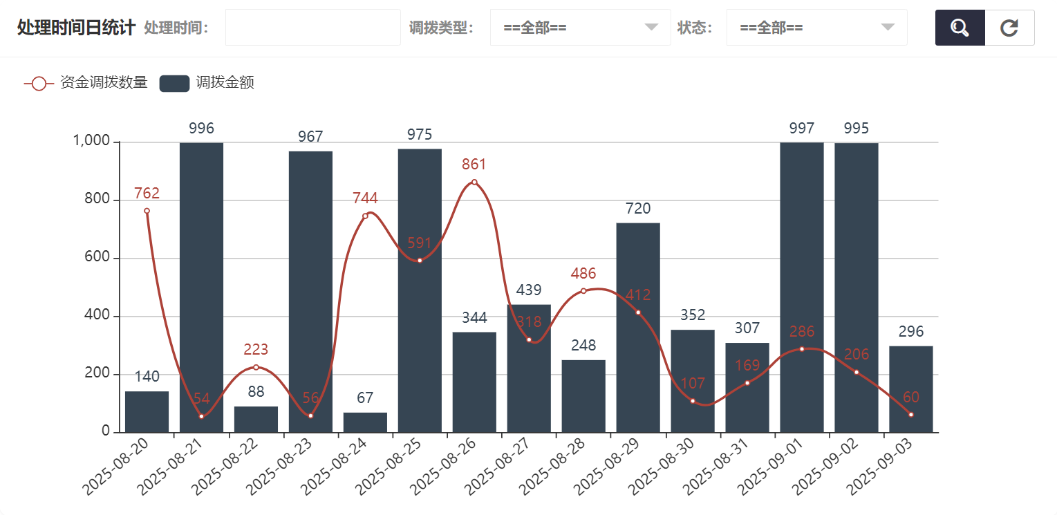 在资金调拨统计中可以看到调拨类型统计、状态统计、处理时间年统计、处理时间月统计、处理时间日统计,处理时间日统计如图所示:
