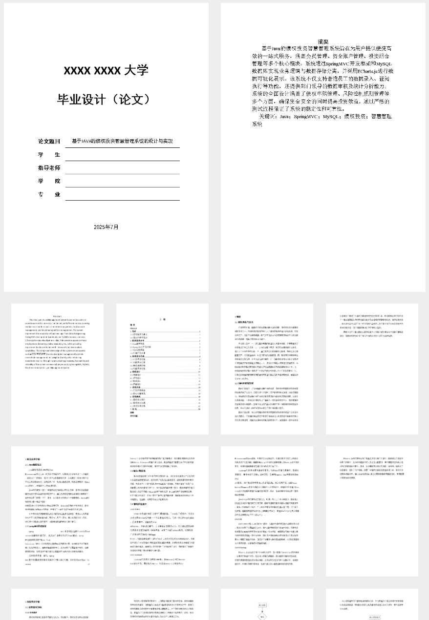 债权投资智慧管理系统主要功能全面覆盖会员管理、资金账户管理、投资组合管理等,并通过SpringMVC和MySQL实现,简化了传统选题的复杂度。系统设计采用模块化结构,确保零基础开发者也能轻松上手。该系统的创新性体现在智能化的风险控制规则管理和实时的数据可视化分析中,实用性在于它能够有效提升债权投资项目管理效率与安全性。相比于传统的单一功能管理系统或模板类毕设题目,“烂大街”的选题缺乏新颖性和实际应用价值;而本系统则通过提供完整的解决方案和详尽的文档支持,使得学生不仅学到开发技能,还能理解整个项目的设计过程和技术细节,并具备进一步探索的空间。