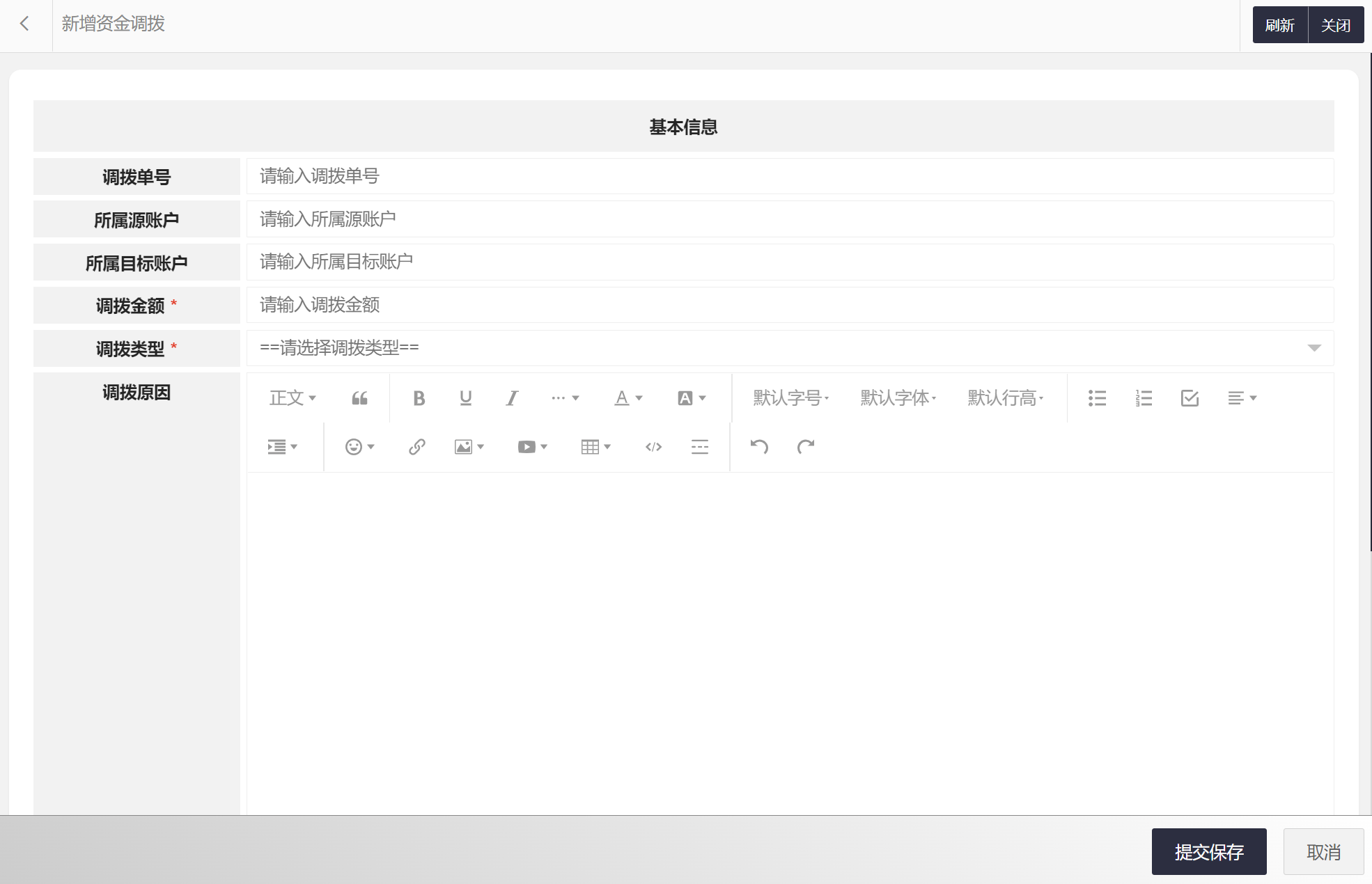 在资金调拨列表中可以选择新增资金调拨、编辑资金调拨、删除资金调拨、搜索资金调拨等。资金调拨属性包括:资金调拨编码、调拨单号、所属源账户、所属目标账户、调拨金额、调拨类型、调拨原因、状态、处理时间等。新增资金调拨界面如图所示: