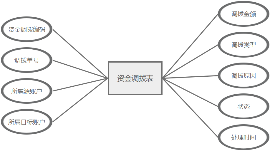 资金调拨管理主要属性包括:资金调拨编码、调拨单号、所属源账户、所属目标账户、调拨金额、调拨类型、调拨原因、状态、处理时间。