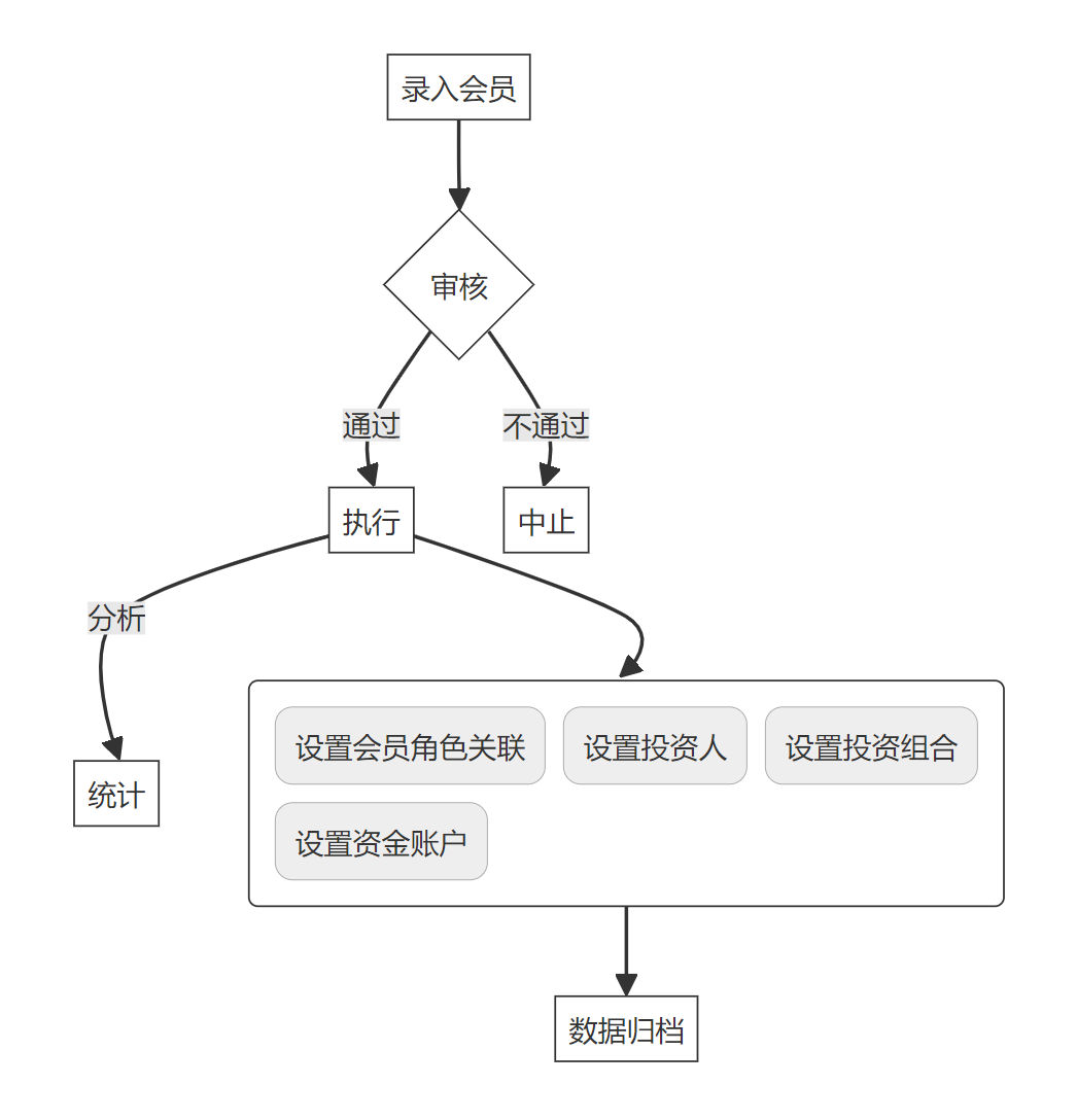 投资组合管理模块主要字段属性包括:投资组合编码、组合名称、所属会员、风险等级、预期收益率、实际收益率和状态。数据录入时普通员工需输入基本信息;查询功能可按会员或风险等级筛选展示对应的投资组合信息;变更操作仅限于成员权限,更新投资组合的状态如转入待审核或审批通过等;部门领导则负责审核信息的准确性,并根据需要调整预期与实际收益值;统计分析管理提供图表展现各投资组合的表现数据。该模块旨在帮助管理者有效监控资金运作情况和风险控制策略实施效果。