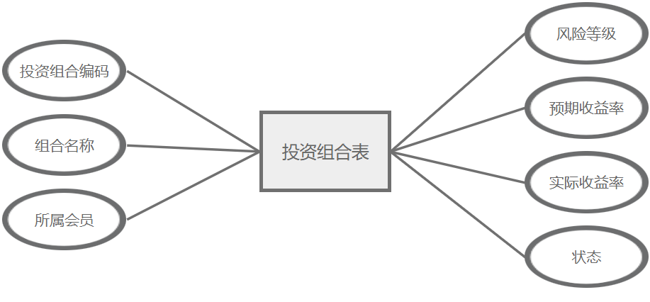 投资组合管理主要属性包括:投资组合编码、组合名称、所属会员、风险等级、预期收益率、实际收益率、状态。