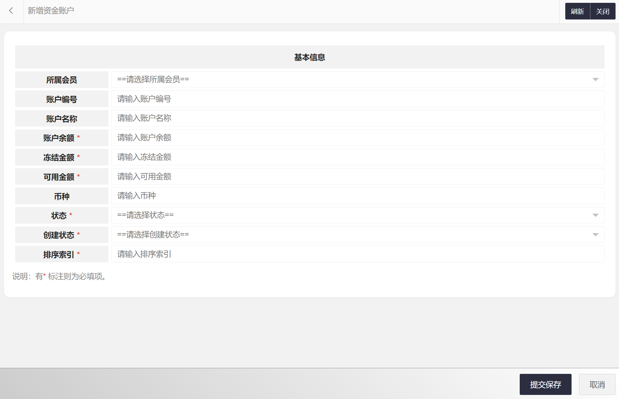 在资金账户列表中可以选择新增资金账户、编辑资金账户、删除资金账户、搜索资金账户等。资金账户属性包括:资金账户编码、所属会员、账户编号、账户名称、账户余额、冻结金额、可用金额、币种、状态等。新增资金账户界面如图所示: