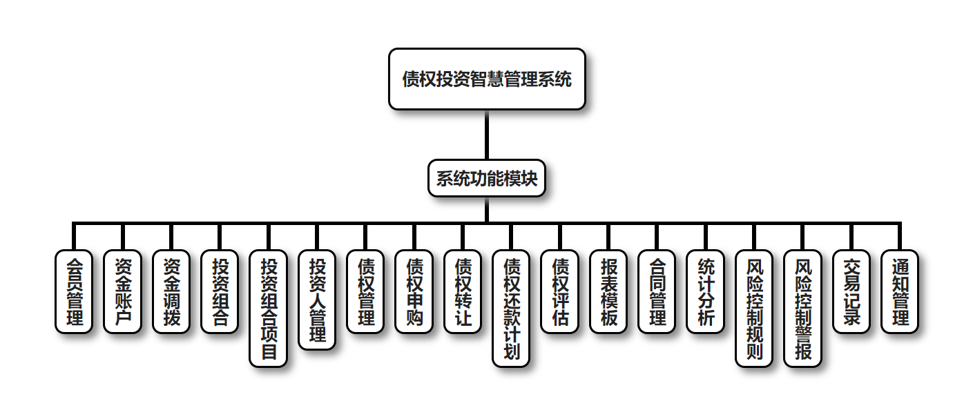 债权投资智慧管理系统的主要功能包括:会员管理、资金账户管理、资金调拨管理、投资组合管理、投资组合项目管理、投资人管理、债权管理、债权申购管理、债权转让管理、债权还款计划管理、债权评估管理、报表模板管理、合同管理、统计分析管理、风险控制规则管理、风险控制警报管理、交易记录管理、通知管理。