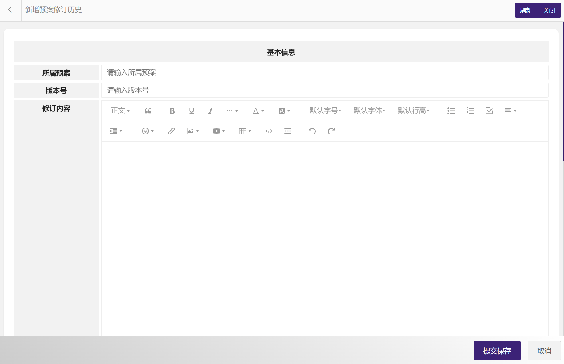 在预案修订历史列表中可以选择新增预案修订历史、编辑预案修订历史、删除预案修订历史、搜索预案修订历史等。预案修订历史属性包括:预案修订历史编码、所属预案、版本号、修订内容、所属修订人、修订时间、修订原因等。新增预案修订历史界面如图所示: