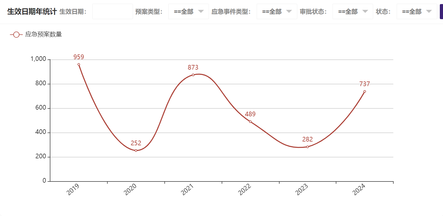 在应急预案统计中可以看到预案类型统计、应急事件类型统计、生效日期年统计、生效日期月统计、生效日期日统计、失效日期年统计、失效日期月统计、失效日期日统计、审批状态统计、审批时间年统计、审批时间月统计、审批时间日统计、状态统计,生效日期年统计如图所示: