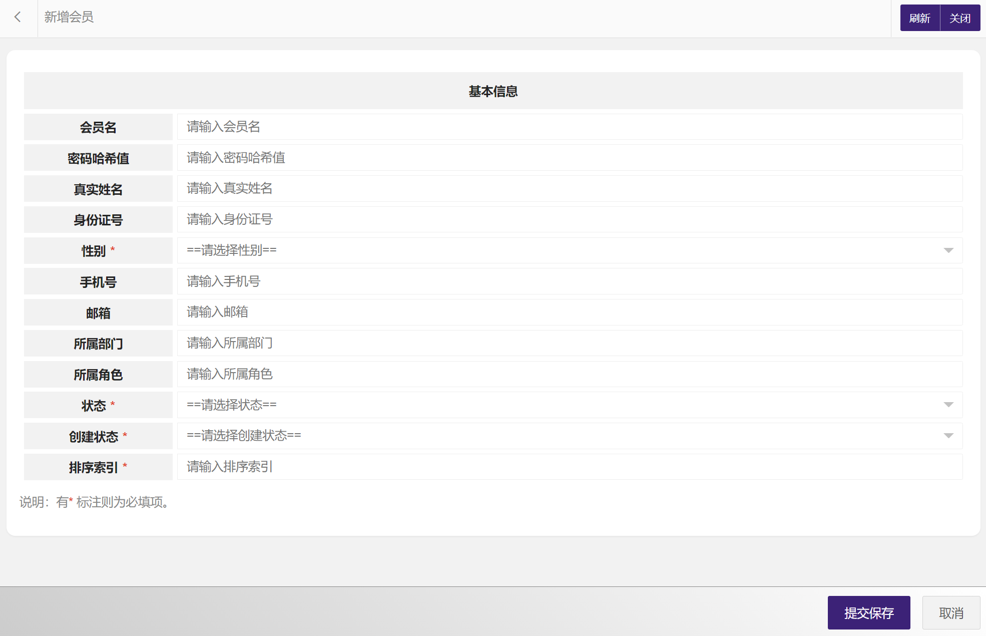 在会员列表中可以选择新增会员、编辑会员、删除会员、搜索会员等。会员属性包括:会员编码、会员名、密码哈希值、真实姓名、身份证号、性别、手机号、邮箱、所属部门、所属角色、状态等。新增会员界面如图所示: