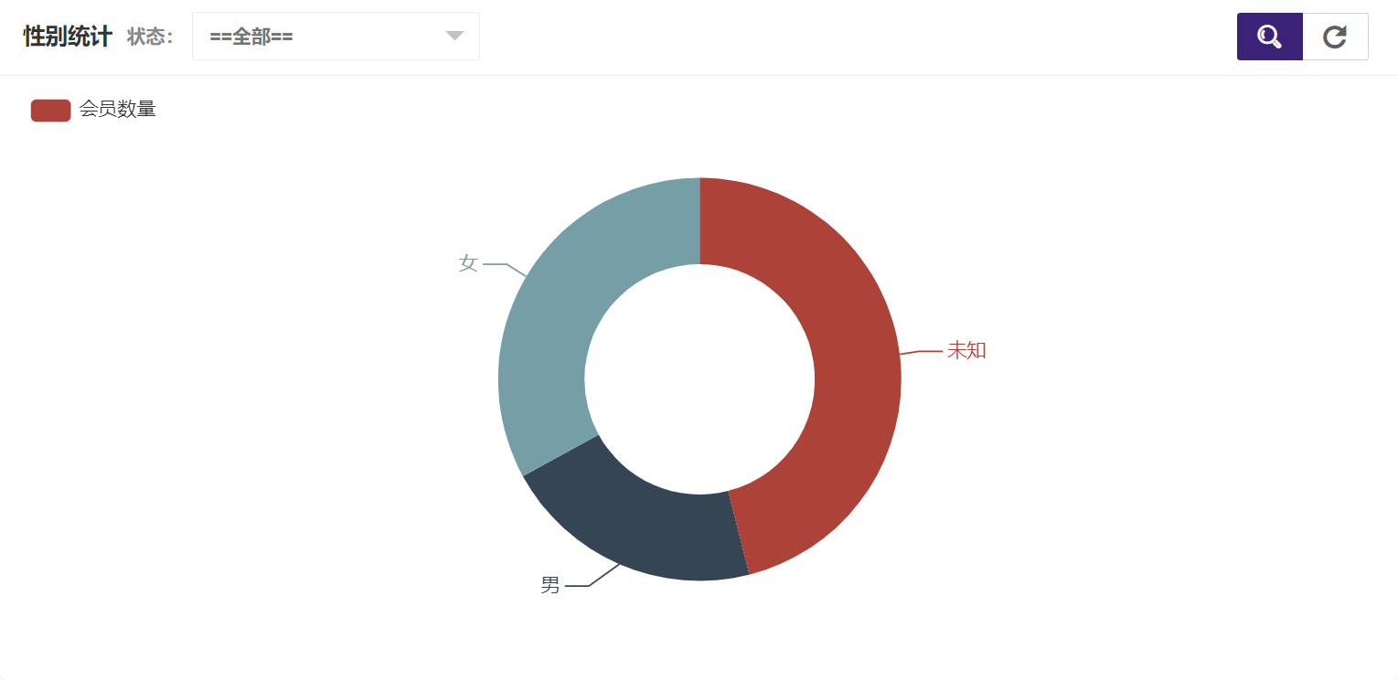 在会员统计中可以看到性别统计、状态统计,性别统计如图所示: