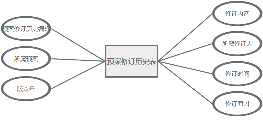 预案修订历史管理主要属性包括:预案修订历史编码、所属预案、版本号、修订内容、所属修订人、修订时间、修订原因。