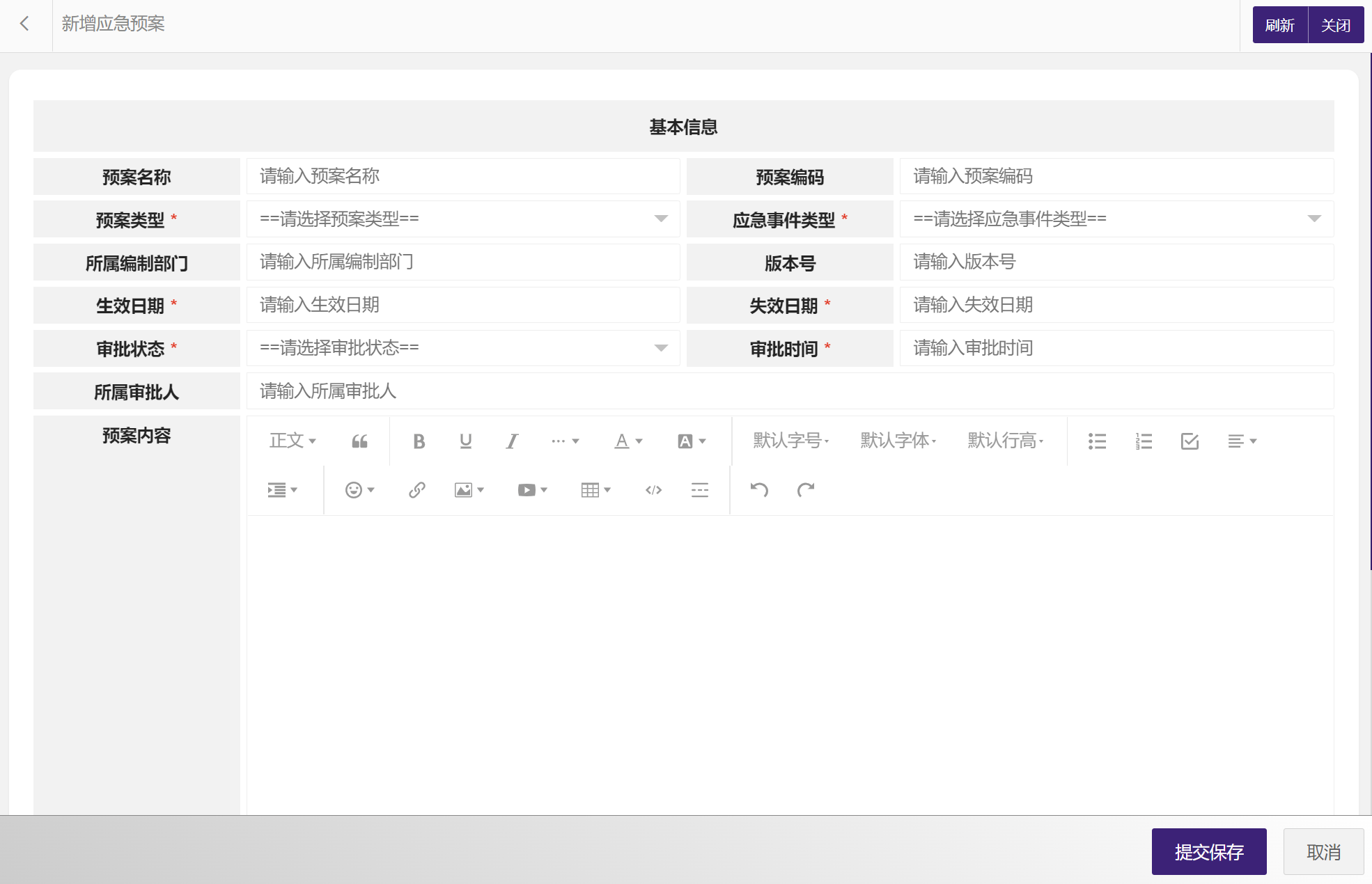 在应急预案列表中可以选择新增应急预案、编辑应急预案、删除应急预案、搜索应急预案等。应急预案属性包括:应急预案编码、预案名称、预案编码、预案类型、应急事件类型、所属编制部门、版本号、生效日期、失效日期、审批状态、审批时间、所属审批人、预案内容、附件信息 (JSON格式)、状态等。新增应急预案界面如图所示: