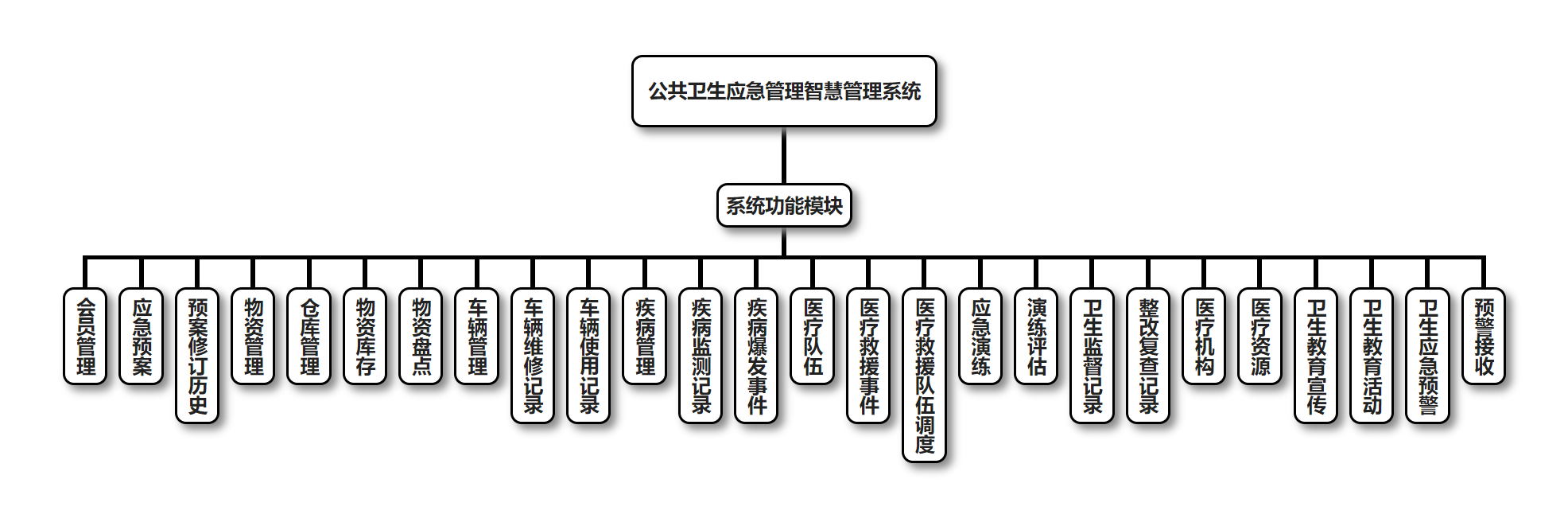 公共卫生应急管理智慧管理系统的主要功能包括:会员管理、应急预案管理、预案修订历史管理、物资管理、仓库管理、物资库存管理、物资盘点管理、车辆管理、车辆维修记录管理、车辆使用记录管理、疾病管理、疾病监测记录管理、疾病爆发事件管理、医疗队伍管理、医疗救援事件管理、医疗救援队伍调度管理、应急演练管理、演练评估管理、卫生监督记录管理、整改复查记录管理、医疗机构管理、医疗资源管理、卫生教育宣传管理、卫生教育活动管理、卫生应急预警管理、预警接收管理。