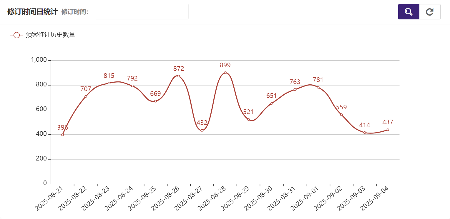 在预案修订历史统计中可以看到修订时间年统计、修订时间月统计、修订时间日统计,修订时间日统计如图所示: