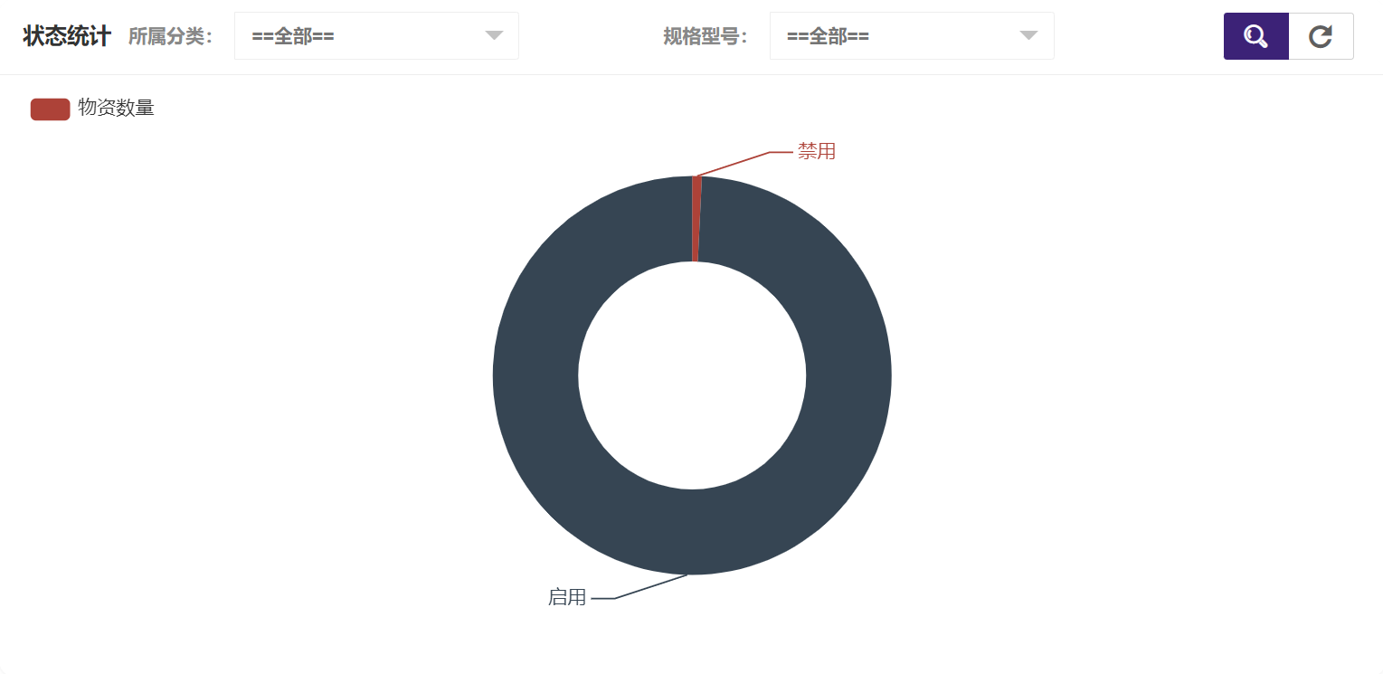 在物资统计中可以看到所属分类统计、规格型号统计、状态统计,状态统计如图所示: