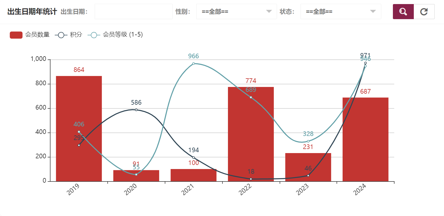 在会员统计中可以看到性别统计、出生日期年统计、出生日期月统计、出生日期日统计、注册时间年统计、注册时间月统计、注册时间日统计、状态统计,出生日期年统计如图所示:
