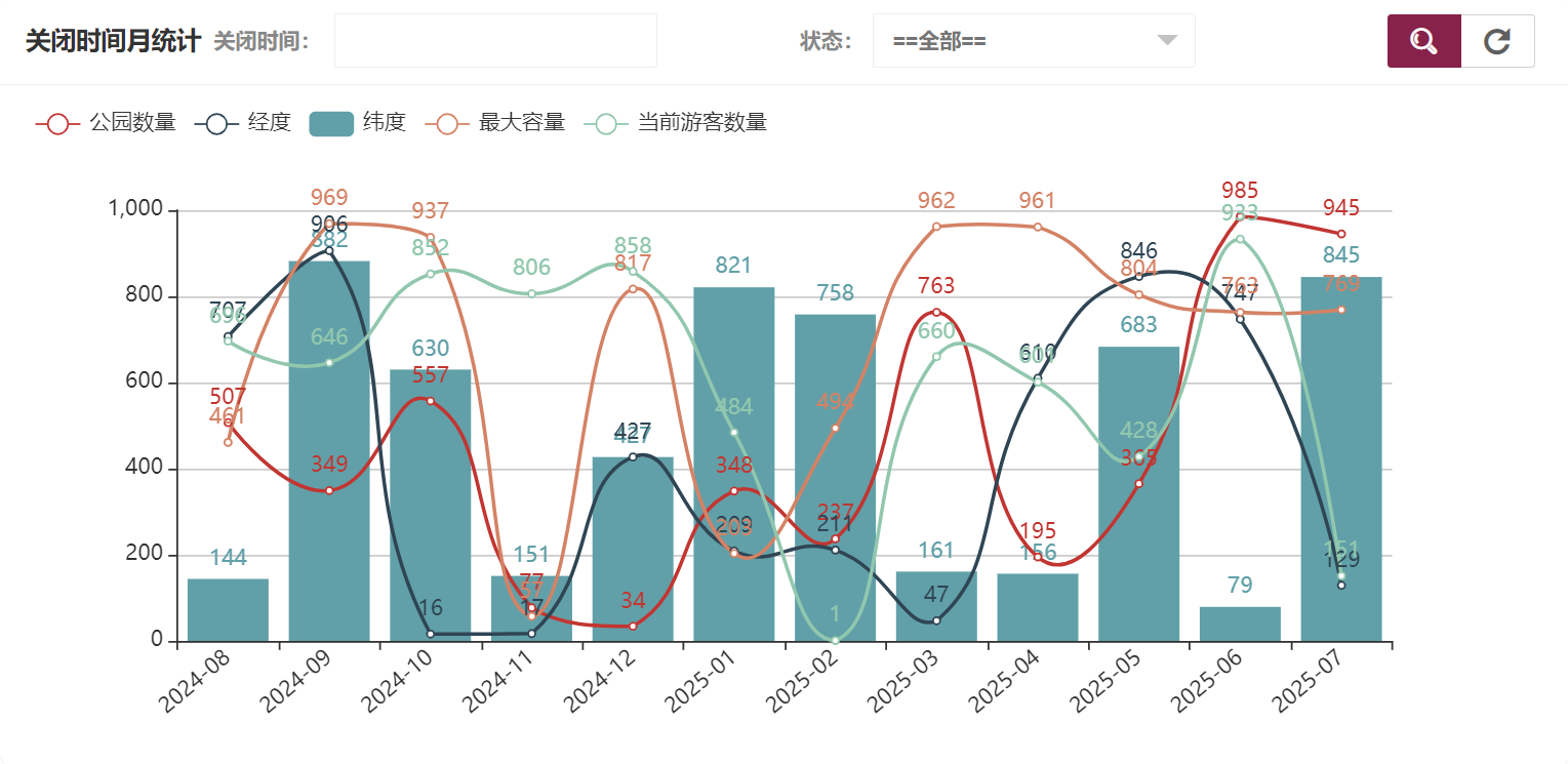 在公园统计中可以看到开放时间年统计、开放时间月统计、开放时间日统计、关闭时间年统计、关闭时间月统计、关闭时间日统计、状态统计,关闭时间月统计如图所示: