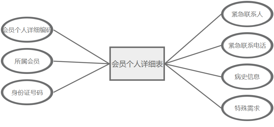 会员个人详细管理主要属性包括:会员个人详细编码、所属会员、身份证号码、紧急联系人、紧急联系电话、病史信息、特殊需求。