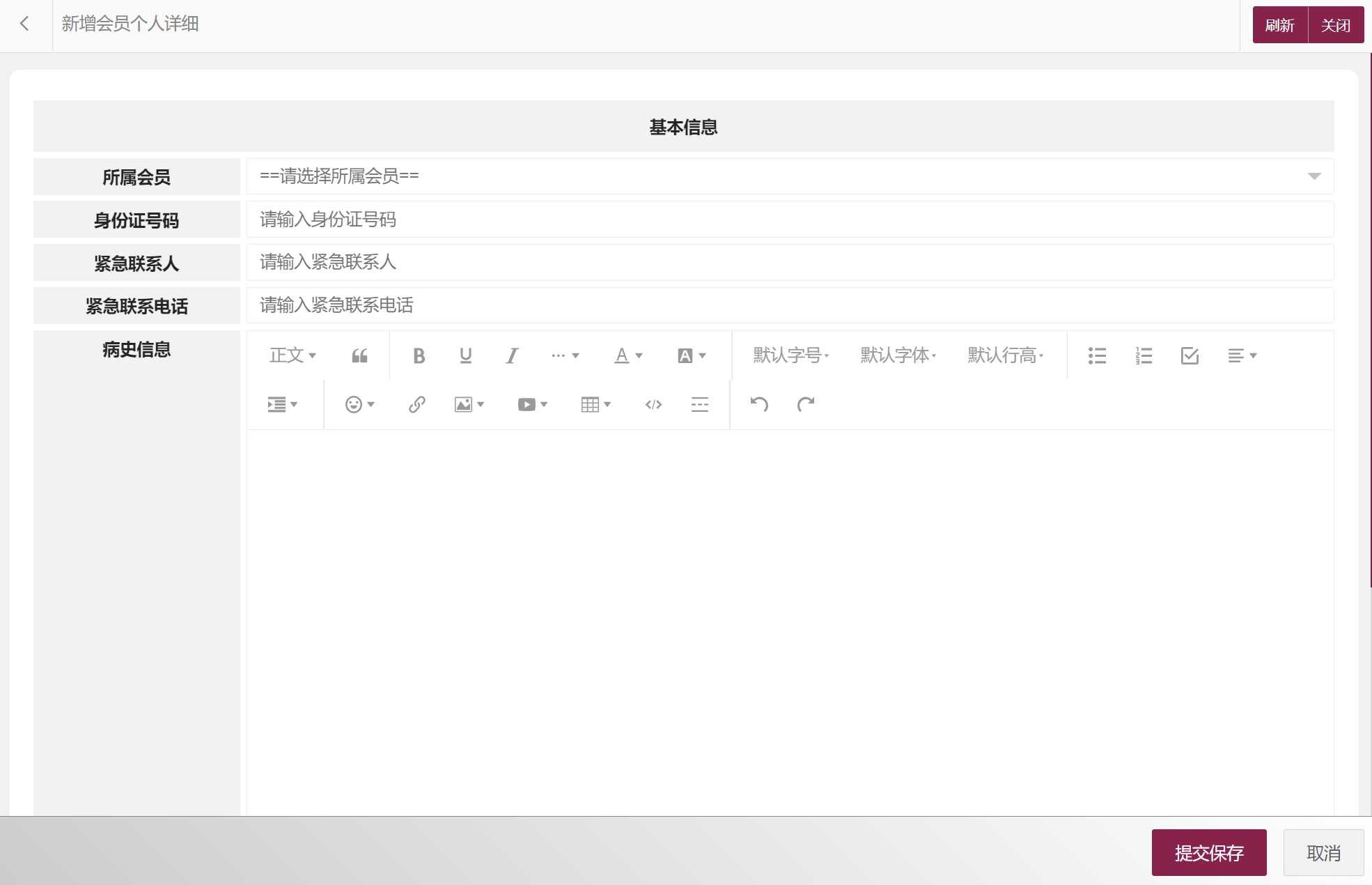 在会员个人详细列表中可以选择新增会员个人详细、编辑会员个人详细、删除会员个人详细、搜索会员个人详细等。会员个人详细属性包括:会员个人详细编码、所属会员、身份证号码、紧急联系人、紧急联系电话、病史信息、特殊需求等。新增会员个人详细界面如图所示: