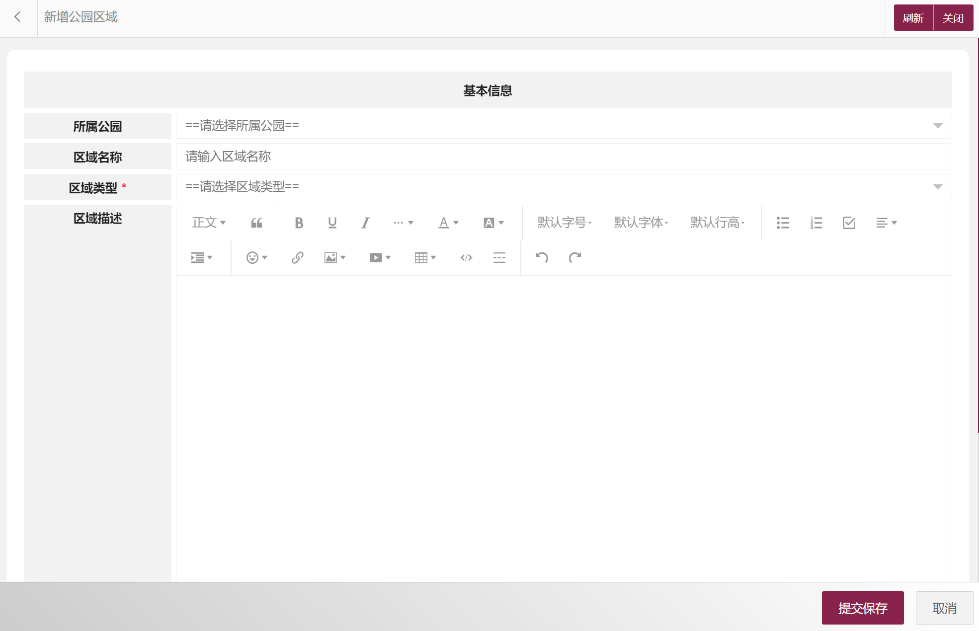 在公园区域列表中可以选择新增公园区域、编辑公园区域、删除公园区域、搜索公园区域等。公园区域属性包括:公园区域编码、所属公园、区域名称、区域类型、区域描述、状态等。新增公园区域界面如图所示: