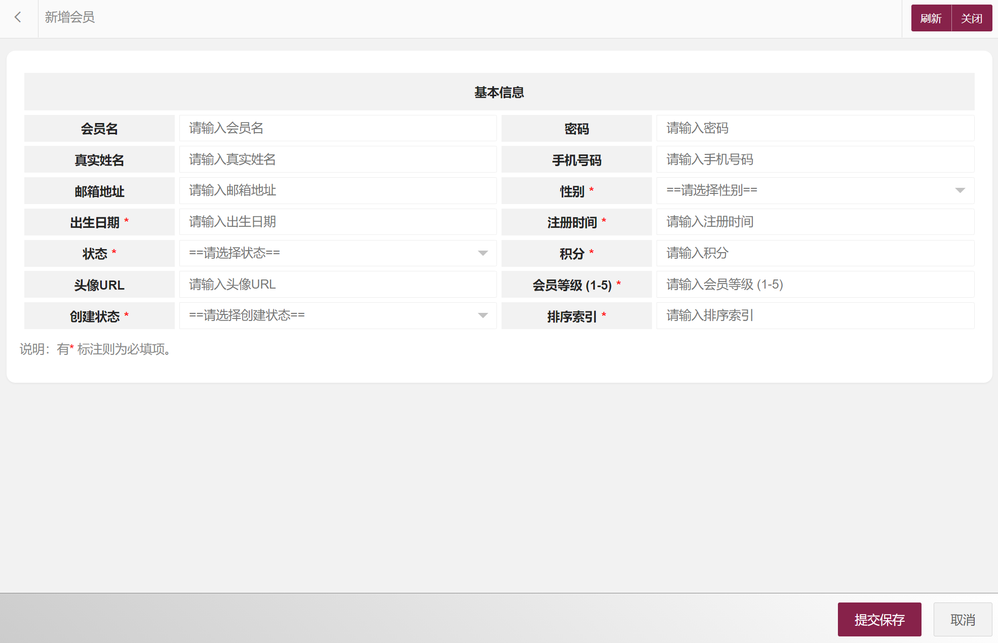 在会员列表中可以选择新增会员、编辑会员、删除会员、搜索会员等。会员属性包括:会员编码、会员名、密码、真实姓名、手机号码、邮箱地址、性别、出生日期、注册时间、状态、积分、头像URL、会员等级 (1-5)等。新增会员界面如图所示: