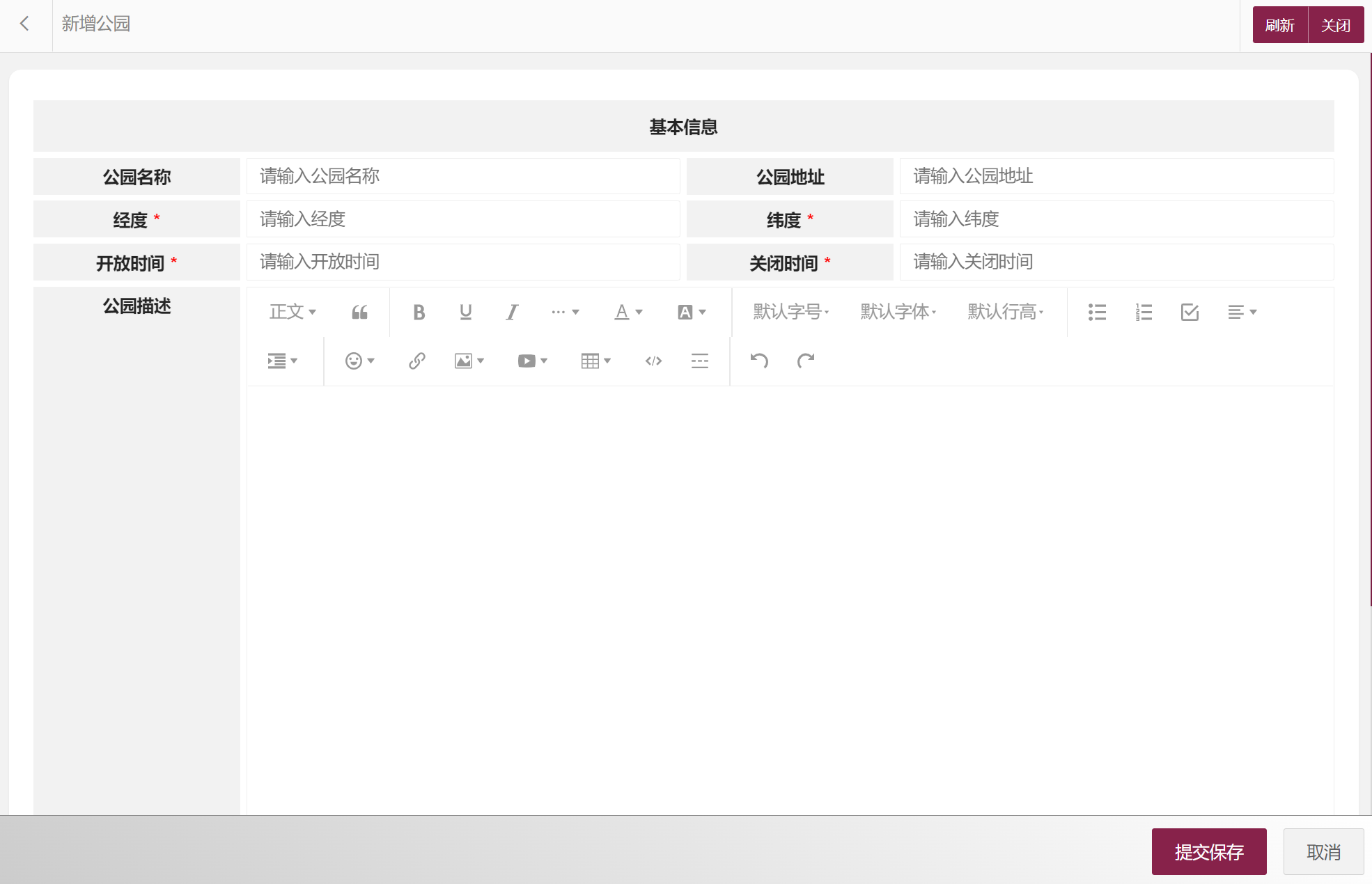 在公园列表中可以选择新增公园、编辑公园、删除公园、搜索公园等。公园属性包括:公园编码、公园名称、公园地址、经度、纬度、开放时间、关闭时间、公园描述、状态、最大容量、当前游客数量等。新增公园界面如图所示: