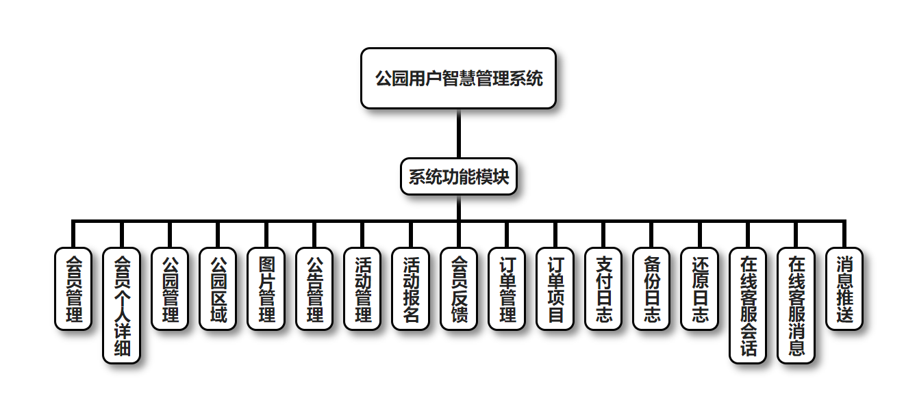 公园用户智慧管理系统的主要功能包括:会员管理、会员个人详细管理、公园管理、公园区域管理、图片管理、公告管理、活动管理、活动报名管理、会员反馈管理、订单管理、订单项目管理、支付日志管理、备份日志管理、还原日志管理、在线客服会话管理、在线客服消息管理、消息推送管理。