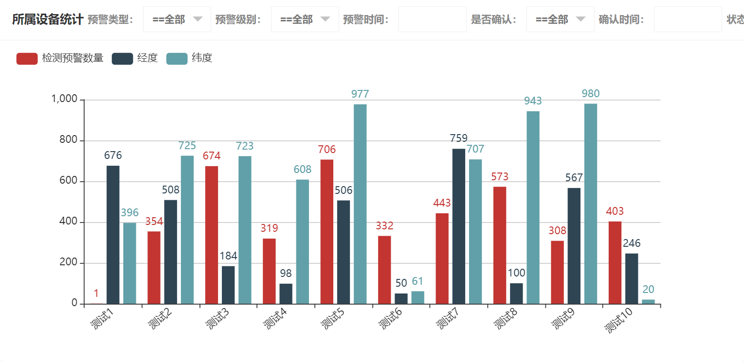 在检测预警统计中可以看到预警类型统计、所属设备统计、预警级别统计、预警时间年统计、预警时间月统计、预警时间日统计、是否确认统计、确认时间年统计、确认时间月统计、确认时间日统计、状态统计,所属设备统计如图所示: