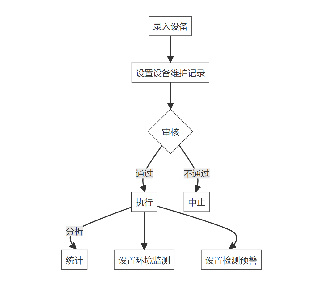设备管理功能定义方面,数据录入包括填写设备编码、名称、类型等信息;查询可通过多种字段进行筛选和匹配获取相关记录;信息变更涉及修改位置、经度纬度或维护周期等内容;审核环节由部门领导验证并确认更新内容准确性与合规性;统计分析则生成各类图表展示关键指标如维护状态分布图,助力决策制定。