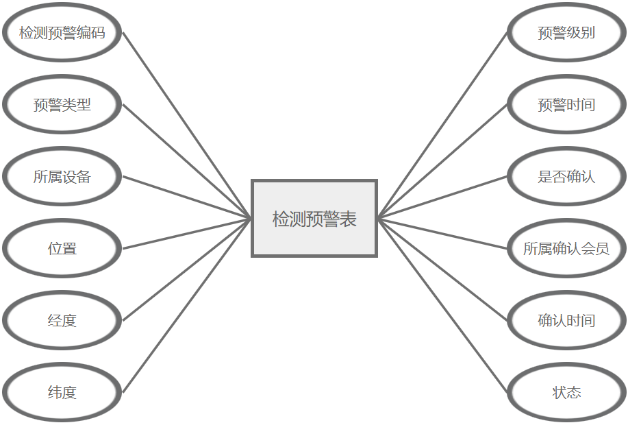 检测预警管理主要属性包括:检测预警编码、预警类型、所属设备、位置、经度、纬度、预警级别、预警时间、是否确认、所属确认会员、确认时间、状态。