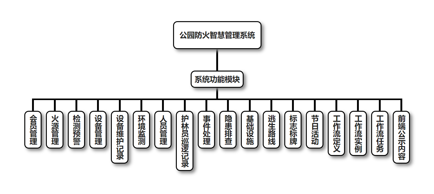 公园防火智慧管理系统的主要功能包括:会员管理、火源管理、检测预警管理、设备管理、设备维护记录管理、环境监测管理、人员管理、护林员巡逻记录管理、事件处理管理、隐患排查管理、基础设施管理、逃生路线管理、标志标牌管理、节日活动管理、工作流定义管理、工作流实例管理、工作流任务管理、前端公示内容管理。