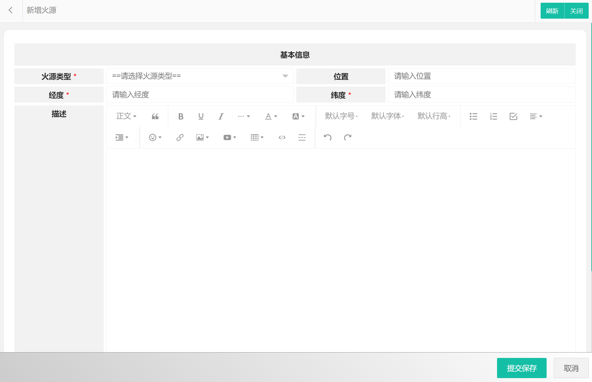在火源列表中可以选择新增火源、编辑火源、删除火源、搜索火源等。火源属性包括:火源编码、火源类型、位置、经度、纬度、描述、发现时间、所属处理人、状态等。新增火源界面如图所示:
