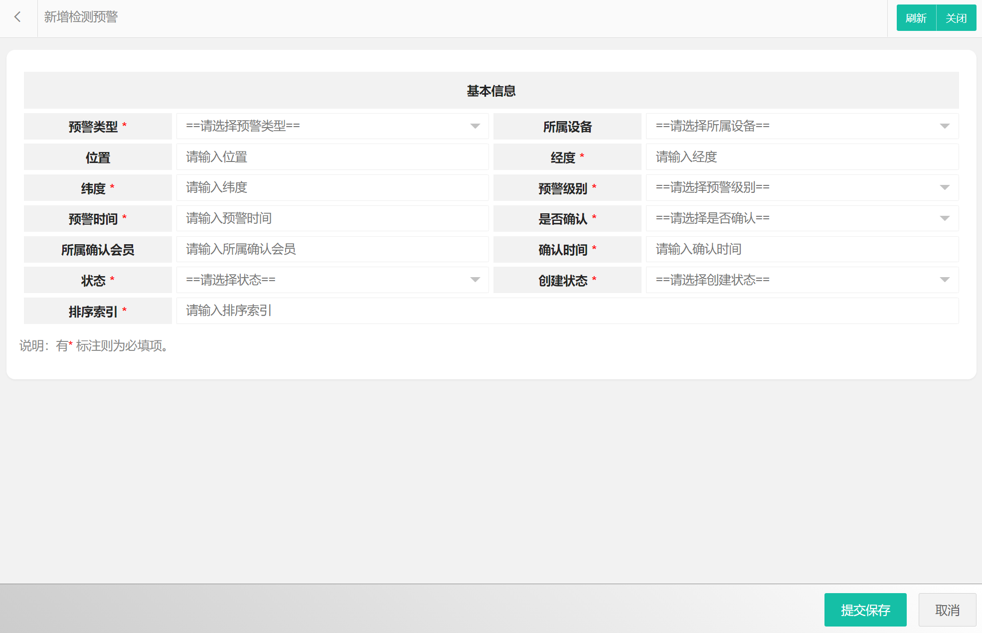 在检测预警列表中可以选择新增检测预警、编辑检测预警、删除检测预警、搜索检测预警等。检测预警属性包括:检测预警编码、预警类型、所属设备、位置、经度、纬度、预警级别、预警时间、是否确认、所属确认会员、确认时间、状态等。新增检测预警界面如图所示: