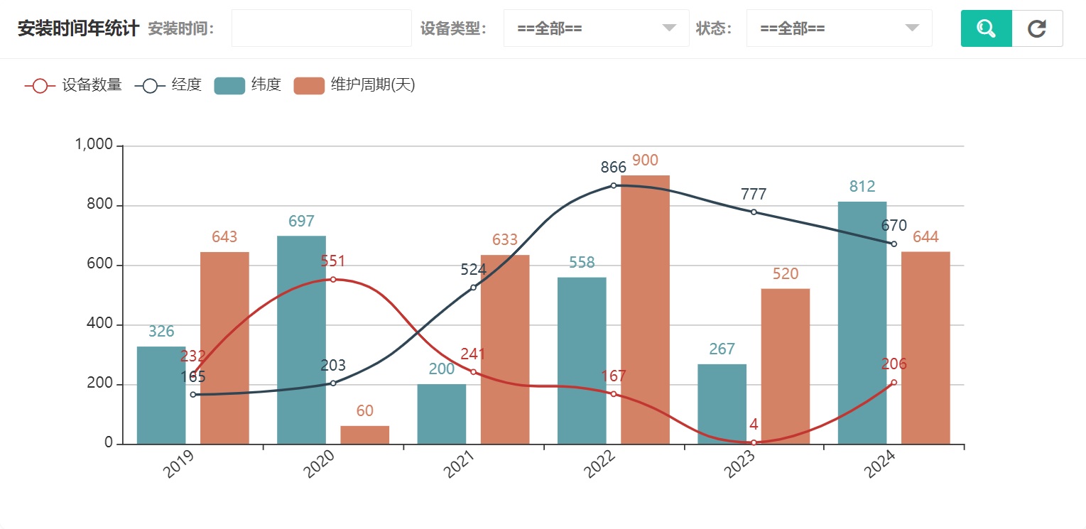 在设备统计中可以看到设备类型统计、安装时间年统计、安装时间月统计、安装时间日统计、上次维护时间年统计、上次维护时间月统计、上次维护时间日统计、下次维护时间年统计、下次维护时间月统计、下次维护时间日统计、状态统计,安装时间年统计如图所示: