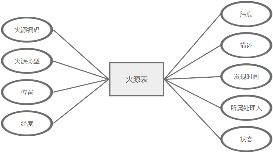 火源管理主要属性包括:火源编码、火源类型、位置、经度、纬度、描述、发现时间、所属处理人、状态。