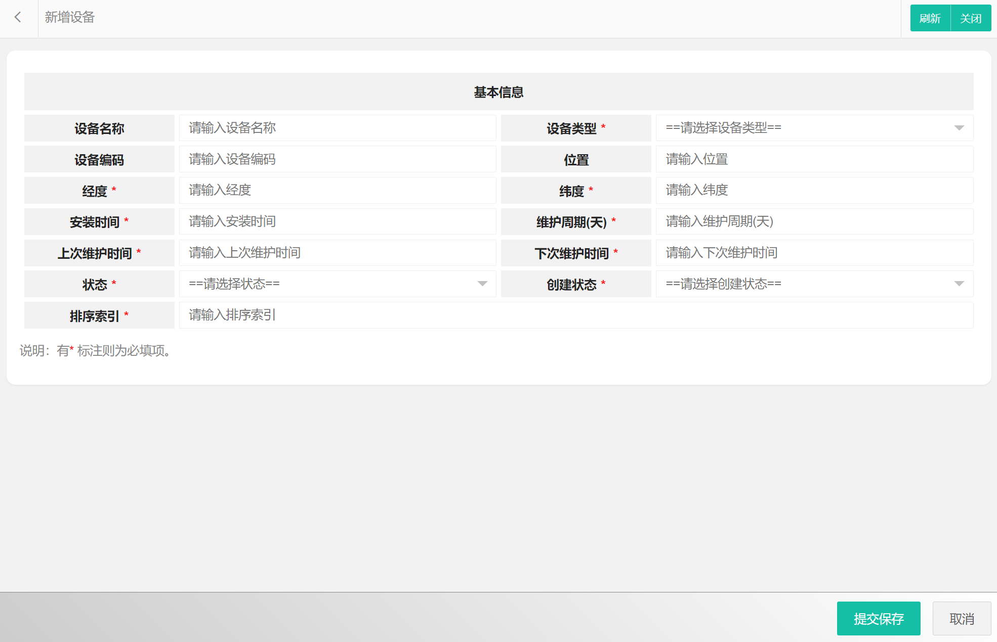 在设备列表中可以选择新增设备、编辑设备、删除设备、搜索设备等。设备属性包括:设备编码、设备名称、设备类型、设备编码、位置、经度、纬度、安装时间、维护周期(天)、上次维护时间、下次维护时间、状态等。新增设备界面如图所示: