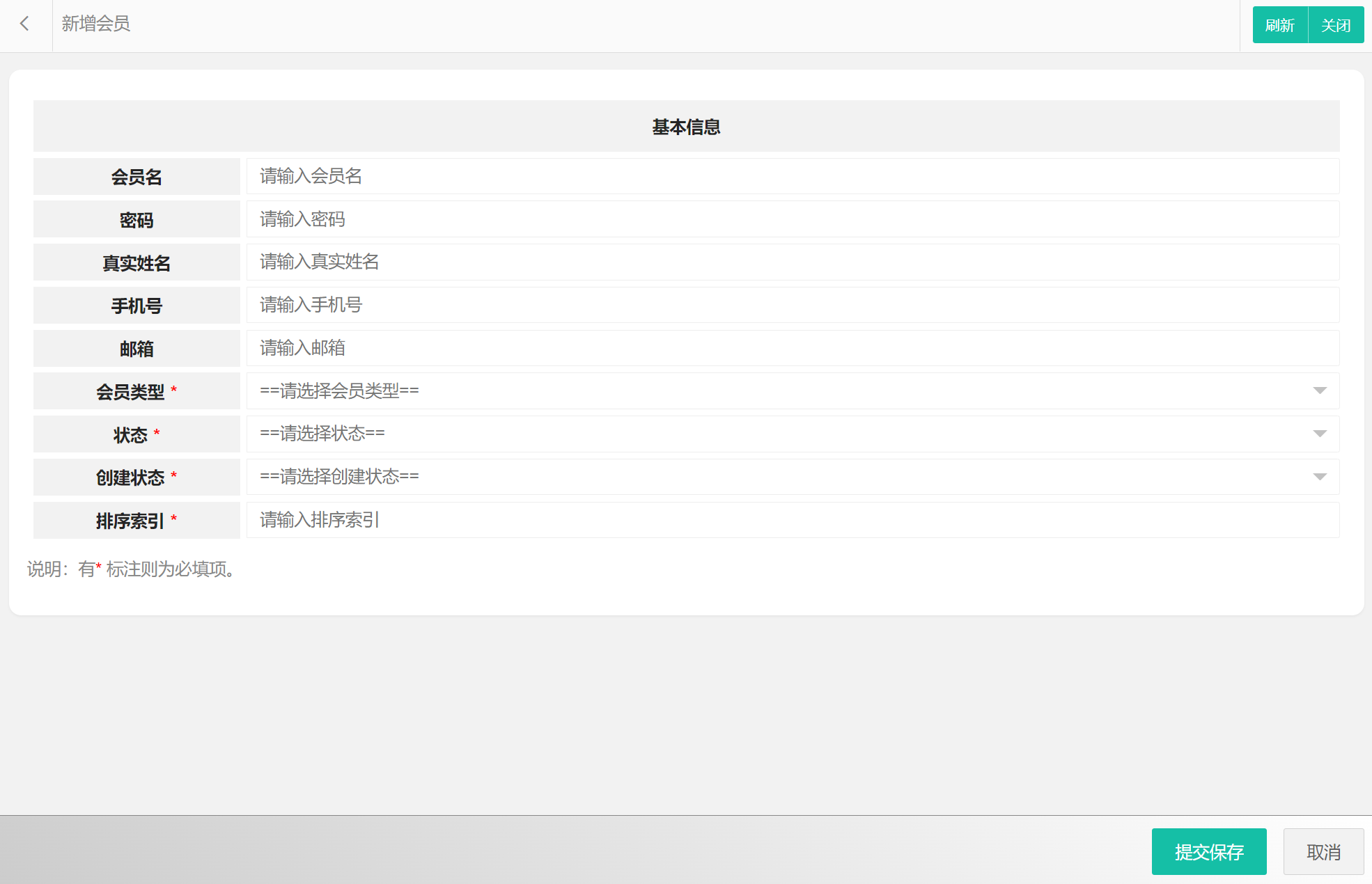 在会员列表中可以选择新增会员、编辑会员、删除会员、搜索会员等。会员属性包括:会员编码、会员名、密码、真实姓名、手机号、邮箱、会员类型、状态等。新增会员界面如图所示:
