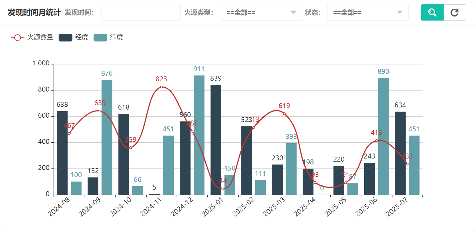 在火源统计中可以看到火源类型统计、发现时间年统计、发现时间月统计、发现时间日统计、状态统计,发现时间月统计如图所示: