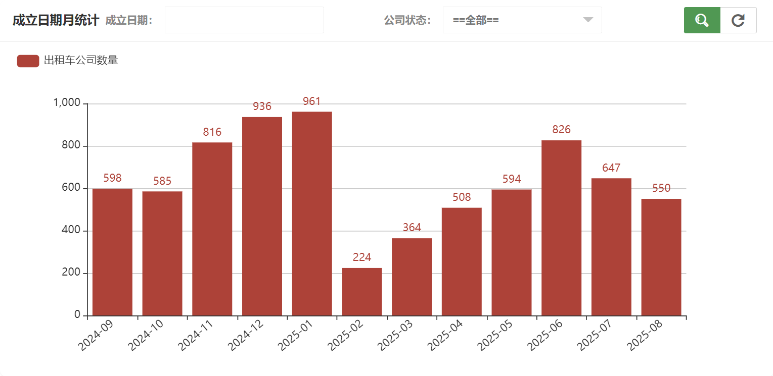 在出租车公司统计中可以看到成立日期年统计、成立日期月统计、成立日期日统计、公司状态统计,成立日期月统计如图所示: