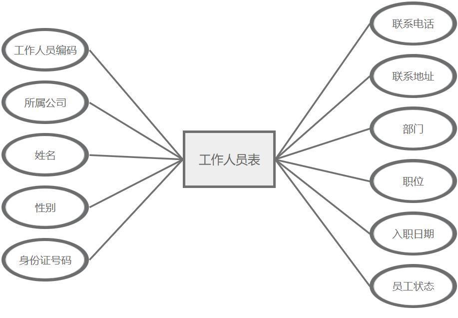 工作人员管理主要属性包括:工作人员编码、所属公司、姓名、性别、身份证号码、联系电话、联系地址、部门、职位、入职日期、员工状态。