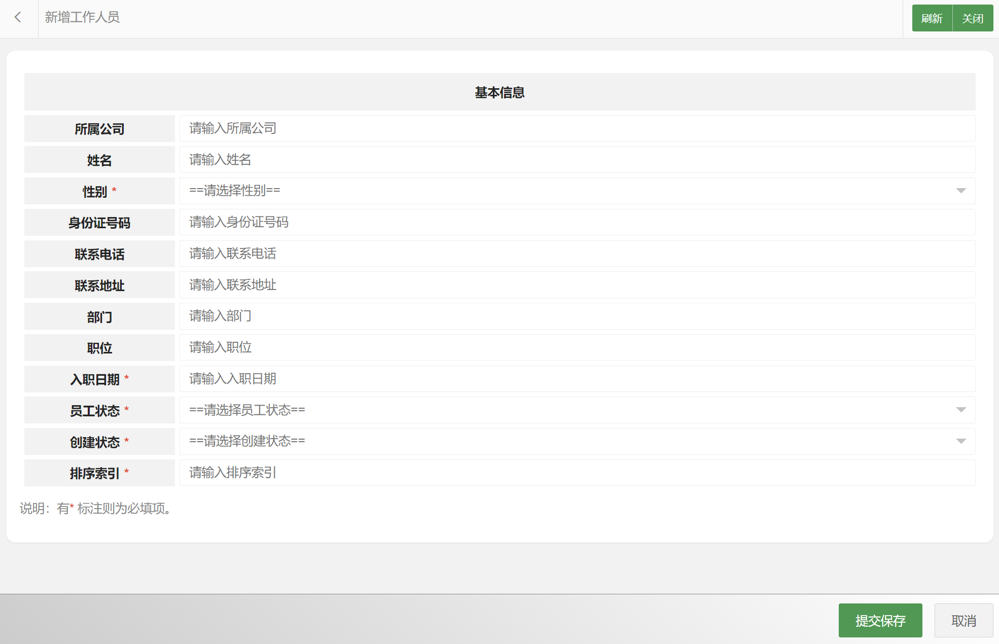 在工作人员列表中可以选择新增工作人员、编辑工作人员、删除工作人员、搜索工作人员等。工作人员属性包括:工作人员编码、所属公司、姓名、性别、身份证号码、联系电话、联系地址、部门、职位、入职日期、员工状态等。新增工作人员界面如图所示:
