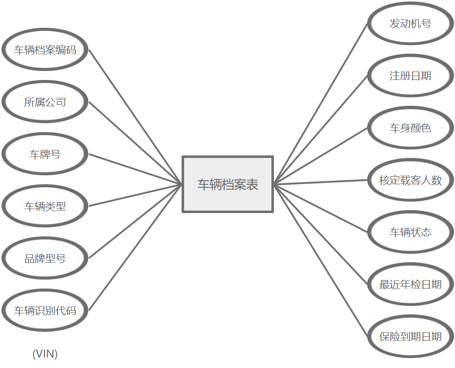 车辆档案管理主要属性包括:车辆档案编码、所属公司、车牌号、车辆类型、品牌型号、车辆识别代码(VIN)、发动机号、注册日期、车身颜色、核定载客人数、车辆状态、最近年检日期、保险到期日期。