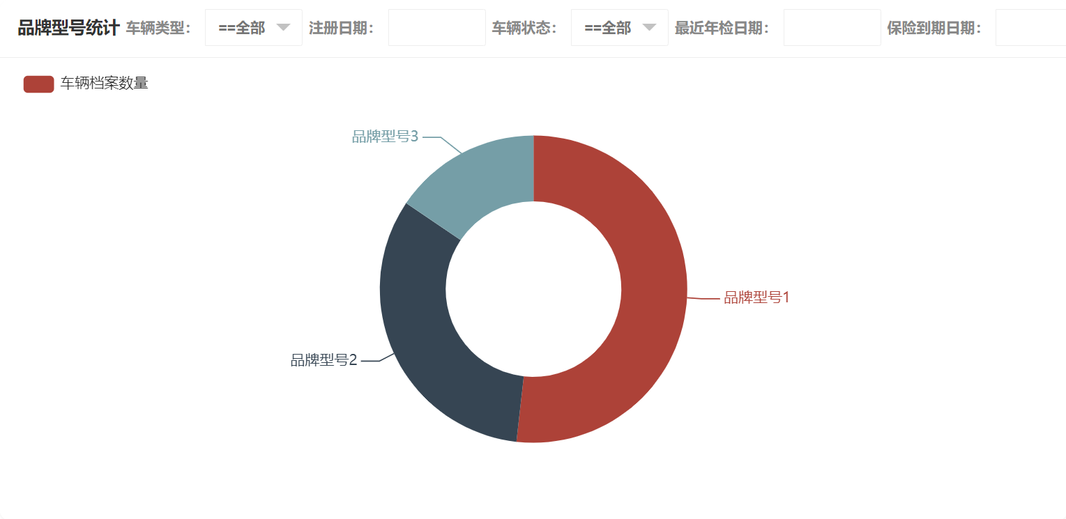 在车辆档案统计中可以看到车辆类型统计、品牌型号统计、注册日期年统计、注册日期月统计、注册日期日统计、车辆状态统计、最近年检日期年统计、最近年检日期月统计、最近年检日期日统计、保险到期日期年统计、保险到期日期月统计、保险到期日期日统计,品牌型号统计如图所示:
